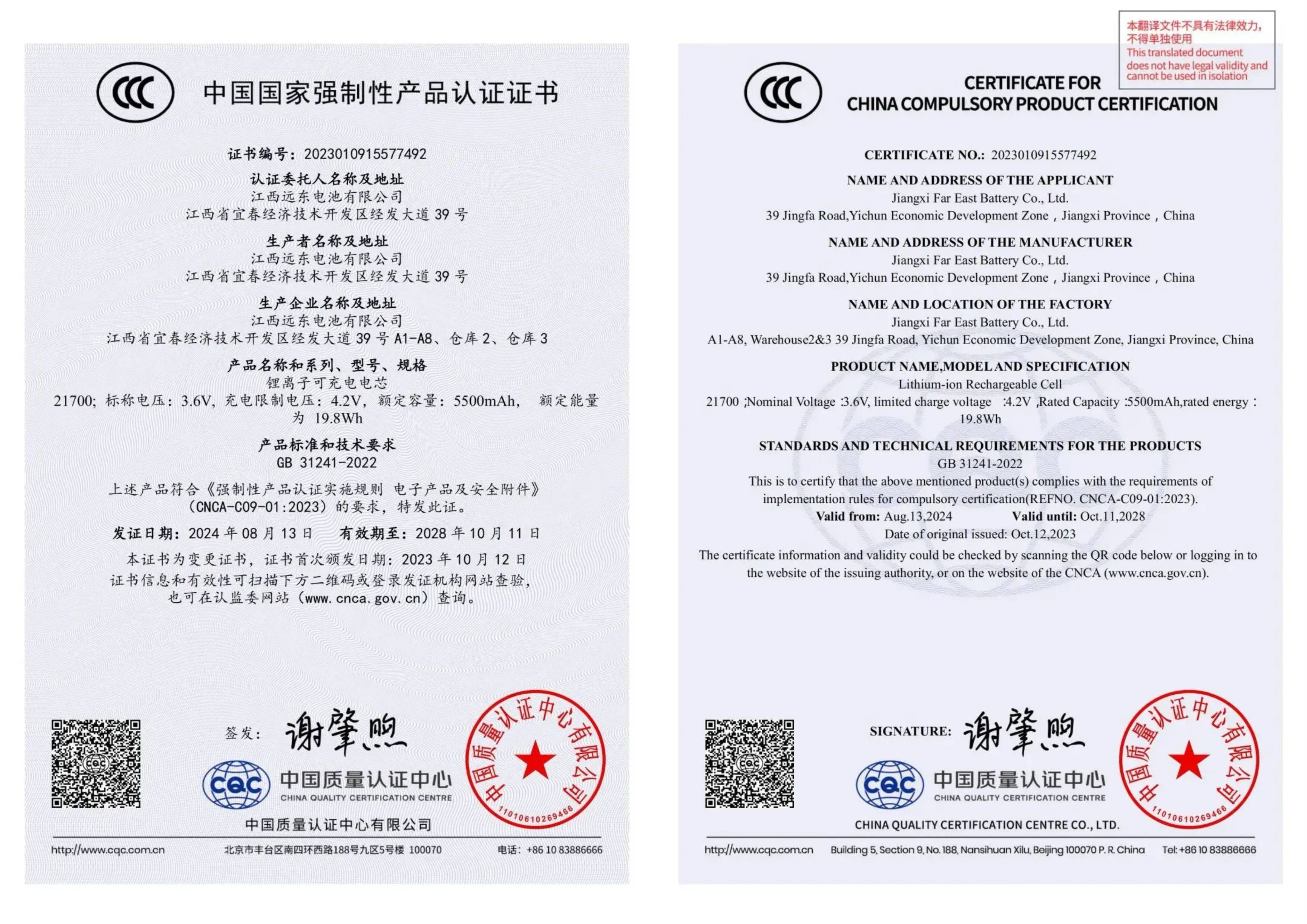 凭借出色的产品性能,远东电池收获了多项权威认证。除满足国家强制性 CCC 认证要求外,还获得了如UL(北美)、IEC(国际电工委员会)、UN38.3(航空运输安全)等多项国际严苛安全标准认证。这些认证绝非一纸空文,而是远东电芯历经短路、挤压、过充、过放、高温、跌落等数十项极限安全测试,在独立第三方实验室的“烈火”中淬炼出的真金品质。每一份证书背后,都是远东对“安全无国界”承诺的无声坚守,为全球用户划定了清晰可靠的安全底线。